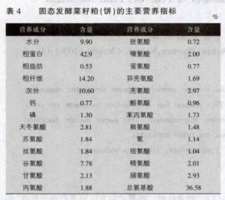 4.5 產品質量標準 四川省畜牧科學研究院研究表明:與普通菜籽粕(餅)相比,固態發酵菜籽粕(餅)的硫苷降低了 60.2%,粗蛋白提高了16.9%,賴氨酸提高了 24.4%,蛋氨酸提高了10.0%,蘇氨酸提高了17.2%,粗脂肪降低了 59.2%。與豆粕相比,在同等干物質基礎條件下,除粗纖維和賴氨酸外,發酵菜籽粕(餅)的養分含量與豆粕接近。固態發酵菜籽粕(餅)的主要營養指標見表 4。