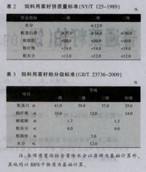 飼料用菜籽粕(餅)的感官性狀為褐色、小瓦片狀、片狀或餅狀,或為黃色或淺褐色、碎片或粗粉狀;具有菜籽油的香味;無發酵、霉變、結塊及異味。菜籽粕(餅)現行的有效標準包括飼料用菜籽餅(NY/T 125-1989),飼料用菜籽粕(GB/T 23736-2009),菜籽粕(GB/T 22514-2008),飼料用菜籽粕(NY/T 126-2005)和飼料用低硫苷菜籽粕(餅)(NY/T 417-2000)。其中 GB/T 23736-2009 根據菜籽粕中異硫氰酸酯(IIC)的含量將其分為低異硫氰酸酯菜籽粕(≤750mgkg)、中含量異硫氰酸酯菜籽粕(750mgkg<ITC<2000mgkg)和高異硫氰酸酯菜籽粕(2000mgkg<ITC<4000mgkg),其他質量指標見表2和表 3。