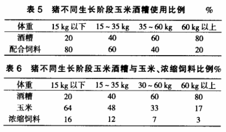 豬隨著體重的增長,采食量增多,日增重增高,但飼料利用率卻有所下降。對于幼齡動物,增重以蛋白質沉積為主,隨著年齡的增長,脂肪的比例明顯上升,單位體重的采食量減少,飼料利用率降低。這是由于合成蛋白質的能量利用效率(36%~70%)比合成脂肪的利用率(70%~79%)低,沉積脂肪的能量轉化效率高,但從生長瘦肉和肥肉的能量消耗來看,因為瘦肉含水70%,而肥肉(脂肪組織)含水 15%,所以生產瘦肉的效率反而高。豬隨著年齡的增長,蛋白質的利用率明顯降低。由于相對生長速度下降,用于維持所需蛋白質的比例增大,用于生長育肥的比例減少。例如,生長豬從20kg長到100kg時,凈蛋白質利用率從 55%下降到 40%左右。所以酒糟、粉碎玉米濃縮飼料配合使用,效果會更好(表5,6)。