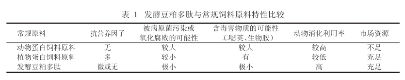 無論與魚粉、血漿蛋白粉、腸膜蛋白、肉骨粉等動物源性蛋白質飼料相比,還是與膨化大豆、豆粕、棉粕等植物類蛋白質飼料相比,大豆經發酵產生的大豆多肽具有多方面的營養優勢和資源優勢,且發酵豆粕成本不高,非常適合于畜牧生產上推廣使用(見表1)。