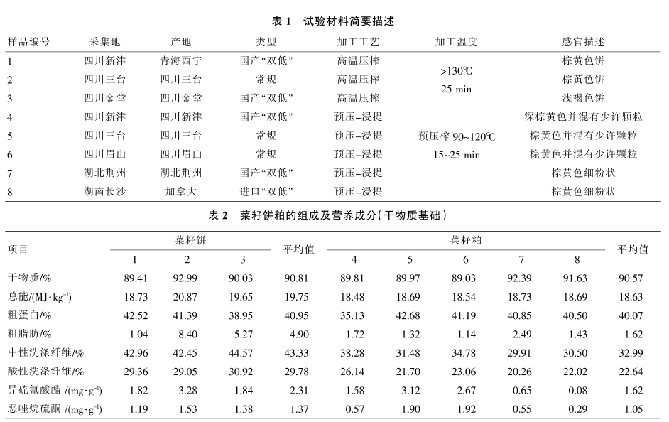 1.1試驗材料 鑒于項目任務的分配和工作量的限制,本研究僅從四川、湖北和湖南三省采集了有代表性的泊菜籽餅粕樣品8個進行評定。樣品簡要描述見表1,其組成及營養水平見表2,氨基酸含量見表3。