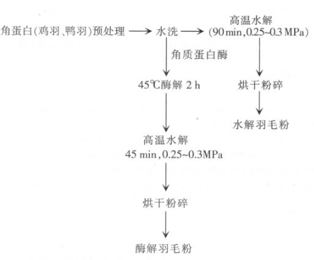 羽毛→預處理(除雜脫水)→高溫高壓水解→烘干→羽毛粉成品