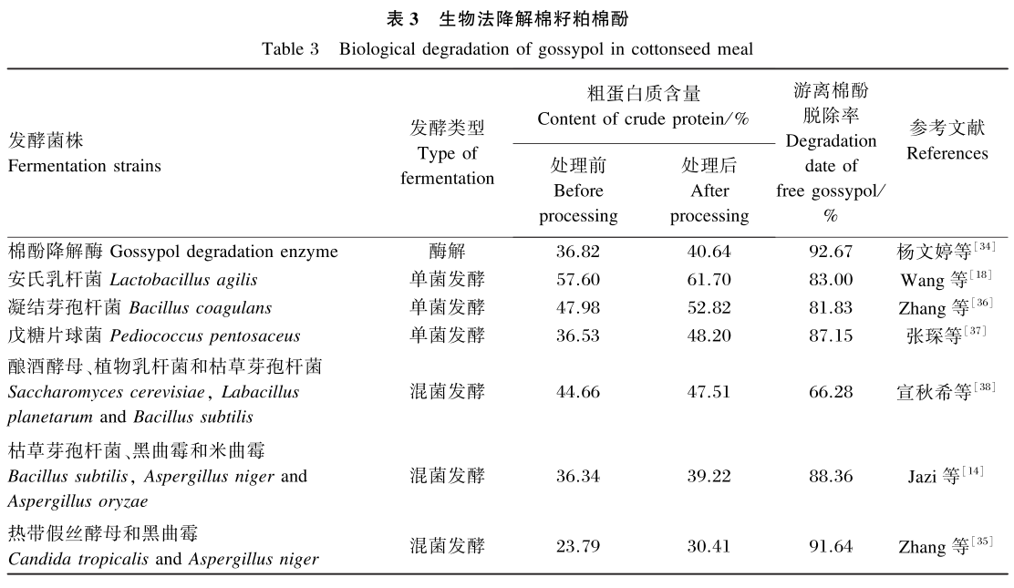 目前棉籽粕脫酚常用的生物法包括酶解法和微生物發酵法(表3)。楊文婷[34]研究發現,在溫度40℃、水分含量35%的條件下,添加5%的棉酚降解酶經過2h可脫除92.67%的游離棉酚,比熱帶假絲酵母ZD-3進行固態發酵后的游離棉酚脫除率高4.46%,且前者極大地縮短了脫毒時間,大大地提升了棉籽粕脫毒效率。微生物發酵法根據發酵的類型可分為單菌發酵和混菌發酵,該方法不僅能提高棉酚降解率,還能夠降低物理法和化學法對棉籽粕中蛋白質的功能和結構產生的破壞作用。Wang等[18]研究發現,安氏乳桿菌在體外接種濃度為5%的條件下,39℃連續發酵5d,棉酚降解率高達83%,粗蛋白質含量提高了4.1%。此外,Zhang等[35]選用熱帶假絲酵母和黑曲霉對棉籽粕進行混菌發酵處理,游離棉酚的降解率可達91.64%,粗蛋白質含量及其體外消化率也得到明顯提高。