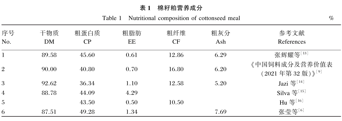 棉籽粕在肉牛上的報道主要集中在生長性能、瘤胃發酵特性和消化率等方面。宮晨[39]用2%棉籽粕、1.8%玉米干酒糟及其可溶物(DDGS)和1.2%味精渣混合替代飼糧中5%豆粕飼喂魯西黃牛,對其生長性能、血液指標和營養物質表觀消化率無不良影響,平均每千克增重成本降低0.29元,提高了養殖效益。荊元強等[40]研究發現,等蛋白質水平下,用棉籽粕全部或部分替代豆粕對肉牛日增重及各項屠宰性能指標的影響均不顯著但棉籽粕的飼糧單價、肉牛每千克增重成本都低于豆粕,每千克增重成本分別降低了0.49和0.68元。Srinath等[41]研究表明,用棉籽粕替代100%豆粕飼喂肉牛對其表觀消化率、瘤胃發酵特性和微生物組成沒有顯著影響。Leite等[42]報道,在放牧肉牛飼糧中補充30%棉籽粕可以提高放牧肉牛的表觀消化率、日采食量和氮利用率。此外,也有研究報道,棉籽粕對肉牛的甲烷(CH4)排放和免疫功能也具有一定的正調控效應。在雨季飼養階段,飼糧中添加0.3%體重的棉籽粕不會對放牧肉牛的瘤胃參數和腸道CH4排放造成明顯的影響而且使得平均日增重提高了15.56%[43]。張曉明等[44]研究表明,飼喂以棉籽粕為蛋白質的飼糧,肉牛增重凈能最高(棉籽粕組22.00MJ/d,豆粕組18.95MJ/d,菜籽粕組21.38MJ/d),CH4排放量最低,相比于豆粕降低了32.79%,在肉牛育肥后期可以用棉籽粕替代豆粕以降低成本。Zhu等[45]在冬季給育肥肉牛飼喂蛋白質水平為10%和14%的棉籽粕飼糧,后者平均日增重、瘤胃微生物蛋白含量和粗蛋白質消化率分別提高了40.91%、8.14%和3.70%,且降低了血清中丙二醛、腫瘤壞死因子-α的含量。