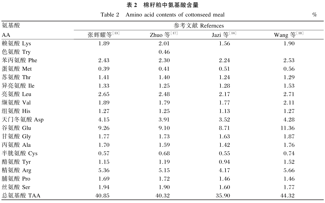 棉籽粕具有豐富的營養成分,可與絕大多數蛋白質類雜粕相媲美。棉籽粕營養成分見表1,造成表中營養成分差異的原因可能與棉籽粕品種、種植地域及榨油工藝等因素有關。棉籽粕中氨基酸種類也比較全面,富含17種氨基酸,棉籽粕中氨基酸含量見表2。此外,棉籽粕中還含有鈣、硫鐵、銅等多種礦物元素和維生素E,對動物的生長發育起著重要作用[6]。
