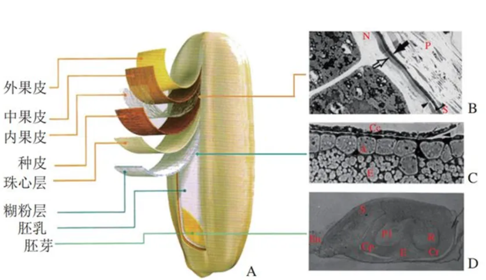 圖1A是稻粒去除稻殼后的結構。米糠作為稻谷碾磨后的主要副產物,主要由果皮、糊粉層、珠心層和胚芽組成,其質量約占稻米總質量的7%~8%左右。圖1B是果皮部分的顯微結構,由果皮P、種皮S和果皮N共同組成;如圖1C所示,稻粒由糊粉層完全包裹,糊粉細胞A形狀為立方體,并與淀粉狀胚乳外層細胞E和胚芽Cc結合;圖1D為胚的縱向切片,其中展現出了胚乳En、胚芽鞘Cp、胚片S、胚層P1、胚根R、外胚層E和大胚層Cr等結構。