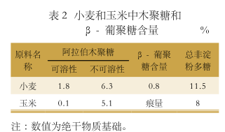 小麥與玉米的營養價值見表1。從表中可以看到,小麥的消化能低于玉米,小麥中粗蛋白含量及氨基酸水平均比玉米高。另外,小麥的非淀粉性多糖含量較高(見表2),非淀粉多糖對豬的影響主要表現在3個方面:1)提高小腸內容物黏度,降低食糜流動性,妨礙食糜內糖、氨基酸和其他養分的消化吸收;2)非淀粉性多糖在腸道內蓄積,為腸道微生物繁殖提供了條件;)改變消化道的分泌功能,導致消化器官增大,消化液分泌增加,從而影響物質的吸收率。