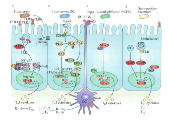 乳酸菌能夠產生一些蛋白質而不經過直接的接觸細胞發揮對腸道屏障的調節作用。例如鼠李糖乳桿菌GG的p40和p75蛋白可抑制細胞因子誘發的上皮細胞凋亡,降低TNF誘發的上皮細胞損傷并促進人和小鼠結腸上皮細胞生長。格氏乳桿菌BL23也編碼p40和p75同源蛋白,并且發揮類似的作用。業已發現,鼠李糖乳桿菌GG編碼的p40蛋白通過表皮生長因子受體介導的信號途徑對腸道屏障功能發揮作用。