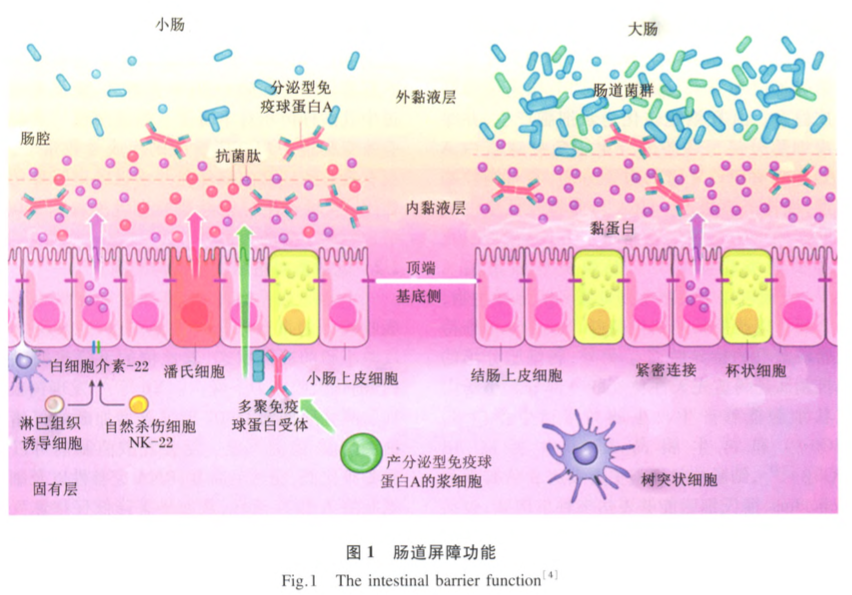 腸道是機體營養物質消化吸收的主要場所,也是機體抵御異物的第一道防線。 腸道屏障功能是指腸道將腸腔環境與機體內組織環境分隔開,防止腸道內致病性抗原、毒素以及致病微生物侵入的功能。腸道屏障主要由腸道正常菌群、黏液層、腸上皮細胞層和腸道免疫系統組成(圖1)。