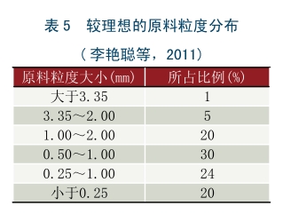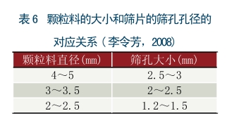 如圖3所示,如果粉碎過細,在淀粉煳化的過程中,先煳化的淀粉容易粘結在一起,將未煳化的顆粒包裹起來,不能吸收外界的熱量和水分,煳化效果反而不好。同時,因粉碎細度的增加而帶來的粉碎成本的提高也不容忽視。也就是說,并不是粉碎的越細越好,要綜合考慮產品質量、粉碎成本和動物生產性能的提高所帶來的經濟效益來決定原料的粉碎粒度。陳中兵(1998)認為,制粒用的細粉應 100%通過 14 目篩,壓制小顆粒時,物料最好粒度是全部通過8目篩,留在 25 目篩上物不超過為25%。比較理想的原料粒度分布見表5(李艷聰等,2011)。李令芳(2008)認為,應根據畜禽品種和顆粒料的直徑大小來合理選擇粉碎機類型和篩片規格(見表6)。一般要求普通魚飼料的粉碎粒度為60目以上,而鱉、蝦等慢食性動物的飼料,應粉碎至100%過80目篩(秦玉昌等,2001)。