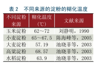 淀粉要發揮其功能特性,首先要通過加熱,破壞原來的分子結構,使之發生分子內重排,即形成煳化淀粉(Schwartz和Zelinskie,1978)。糊化淀粉具有一定的粘性,可提高顆粒飼料的耐久性和成型性,因此在制粒過程中,淀粉常常發揮著粘合劑的作用。不同來源的淀粉的煳化溫度(見表2)和結合力不同,大麥和小麥的淀粉的結合力比較高,而玉米和高梁就不太理想,這是由淀粉本身的質量所決定的(秦玉昌等,2001)。