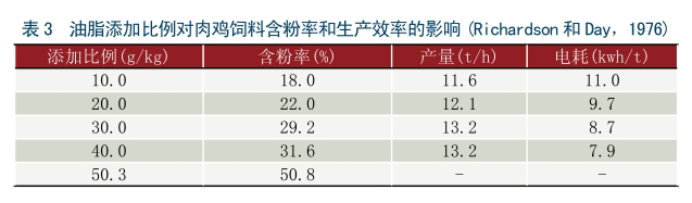 如表3所示,脂肪含量超過2%時,顆粒會發生軟化、松散,脂肪的疏水性還會影響其他水溶性成分的粘合效果,導致飼料的粉化率升高,同時還會增加回機率,降低生產效率(Richardson 和Day,1976)。因此,在生產中為了減少粉塵和滿足營養需要,必須向飼料中添加較多的油脂(>3%),往往在混合時添加2%,其他的部分采用制粒后噴涂工藝添加。脂類的氧化和酸敗也會降低顆粒飼料的物理性質和養分利用(Voragen 等,1995)。