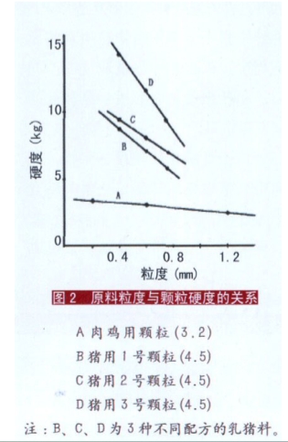 如圖2所示,原料粉碎粒度與顆粒飼料硬度的關系(陳中兵,1998)。因此,從顆粒料的生產效率和顆粒質量的角度考慮,物料粉碎的越細,顆粒質量越好(宋春風等,2010)。飼料原料的粉碎粒度可分為粗粒、中粒、細粒3種,其粒度的大小決定著飼料組分的總表面積(周根來,2010;馬巖,2010)。飼料原料的絕熱性能通常比較好,即熱傳導系數低,在一定的時間內,熱量和水分在其中的傳導比較緩慢。物料的粉碎粒度越小,其顆粒的比表面積就越大,調質時水蒸汽就越容易穿透顆粒內部,同時熱量和水分的傳導速度就越快,淀粉和蛋白質等煳化越完全,調質效果就越好。這時的物料因為吸收了足夠的熱量和水分,就會變軟變粘,在壓粒很容易成形,而且壓出的顆粒表面光滑,無裂紋、硬度高、粉化率低,同時制粒效率高,對模孔的磨損小。