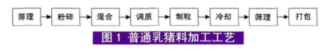 普通乳豬料加工工藝是一種比較簡單的加工工藝。該工藝流程的主要特征如下:使用先粉碎再混合的工藝;在混合工段,包括小料在內的全部物料參與混合;混合之后的物料進入調質器中進行調質,物料得到一定的預熟化;之后物料進入制粒機壓制成顆粒,并最終冷卻和打包得到成品。