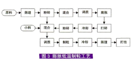 膨脹低溫制粒工藝是對膨脹加工工藝的一種改良的工藝。首先物料經過篩理、粉碎后進行配料混合,混合后的物料通過調質器和膨脹器進行熟化處理。熟化后的物料不直接進行制粒,而是打碎、冷卻并粉碎。之后得到熟化后的粉料再進行二次混合,在二次混合過程中添加一些包括熱敏成分的“小料”,并且在該工段中添加一些不需要熟化的粉碎后的原料。二次混合后再進行低溫調質并制粒,在低溫調質過程中一般溫度為50~55℃。最后冷卻、理并打包,得到最終的成品。