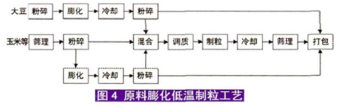 原料膨化低溫制粒工藝與膨脹低溫制粒工藝相比,主要不同點是把配合原料膨脹改為熟化程度比較高的膨化,這里的膨化一般是單一原料的膨化。這個改進主要解決了膨脹熟化程度不足的問題。