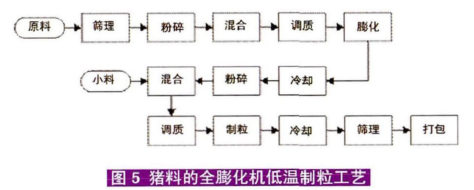 配合豬料的“全膨化低溫制粒工藝”是目前最新應用的一種教槽乳豬料加工工藝。該工藝的特點是除了小料之外的所有配方中的物料都經過專用豬料膨化機擠壓膨化,同時整體熟化程度達到70%~ 75%。