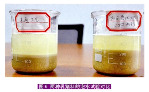 使用兩個容積為500mL的燒杯,兩個燒杯中都盛有350mL的常溫水。擠壓熟化乳豬料和低熟化乳豬料各取50g,同時分別放入如上的兩個燒杯中。從飼料入水后開始計時,發現擠壓熟化乳豬料進入水中8~10s后就已經完全溶解,而低熟化乳豬料則剛剛開始溶解。雖然測試時的環境溫度只有20℃,常溫水的溫度也比較低,可以看出擠壓熟化乳豬料的融水性能是比較強的。