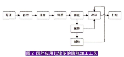 膨脹加工工藝目前在國外應用比較多。該工藝生產得到的最終成品有3種選項:一是直接膨脹并冷卻后的“鍋巴料”;二是經過膨脹、破碎,之后再進行冷卻的破碎料;三是經過膨脹、破碎,并直接制粒,最后冷卻、打包的顆粒料。