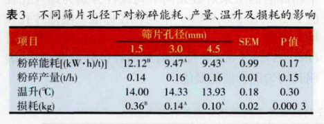 目前關于粉碎機在加工過程中的物料溫升研究較少,但普遍認為原料溫度較高時,加工后溫升較?。涸蠝囟容^低時,加工后溫升較大[21]。本試驗中由于粉碎前玉米溫度一致,粉碎后3個孔徑篩片下的溫升無明顯差異,溫升變化在13.9~14.3℃之間。本試驗測定了粉碎前后玉米損耗的重量,試驗結果顯示1.5mm組損耗最大,與3.0mm組相比損耗增加157%,可能在一定程度上,損耗與粉碎產量有關,由于損耗增加,導致粉碎產量下降。