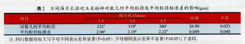 玉米粉碎后對數幾何平均粒徑見表2。飼料的粉碎粒度是指物料粉碎后顆粒的大小,平均粒徑一般采用對數幾何平均粒徑表示,粒度的均勻性用平均粒徑標準差來表示。本試驗結果顯示:1.5、3.0、4.5mm組玉米粉碎后的對數幾何平均粒徑隨篩孔孔徑增大而增大,呈現顯著差異(P<0.05);玉米粉碎后的對數幾何平均粒徑遠遠小于篩片孔徑,1.5、3.0、4.5 mm孔徑下粉碎后的玉米對數幾何平均粒徑分別為篩片孔徑的15.5%、10.6%、8.4%。平均粒徑標準差隨篩片孔徑增大而增大,1.5mm組與3.0mm、4.5mm組差異顯著(P<0.05),1.5mm處理組的平均粒徑標準差最小,表明其均勻混合性能最優。