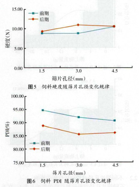 通常PDI在一定程度上影響顆粒飼料的硬度,并且有很大的正相關關系。但是在本試驗中,前期顆粒飼料 PDI和硬度隨篩片孔徑增加呈現負相關系,后期顆粒飼料 PDI最佳的顆粒硬度反而越差,類似的,馬世峰等報道顆粒飼料硬度和PDI與篩片孔徑的變化沒有相關性[8]。同樣Reece等將玉米用安裝孔徑為318、635、953 mm篩片的錘片式粉碎機進行粉碎,試驗結果證明,953um篩片孔徑下,顆粒飼料的耐久性最大購,與本試驗結論相同。