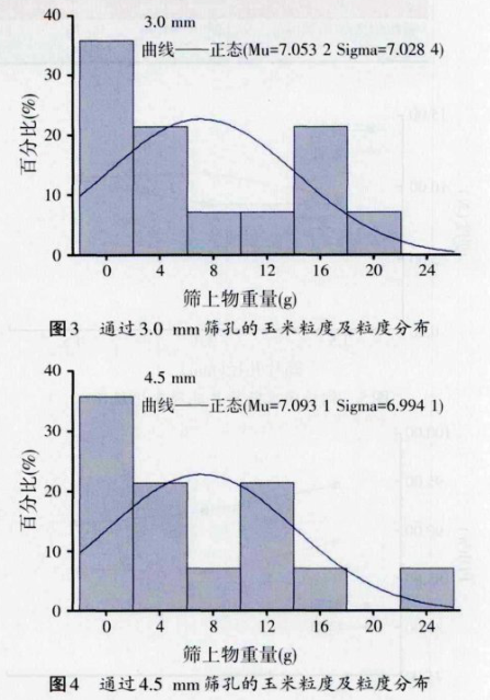 玉米粉碎后篩上物質量分布見圖1~圖4。由圖可知,玉米粉碎通過1.5 mm篩孔的玉米大部分(95.37%)分布在20~140目,正態性檢驗結果顯示,在顯著性水平a=0.05下,1.5 mm篩孔下玉米粉碎粒度的分布不服從正態分布。通過3.0mm篩孔粉碎的玉米,其粒度大部分(98.03%)分布在12~140目,正態性檢驗結果顯示,在顯著性水平a=0.05下,1.5 mm篩孔下玉米粉碎粒度的分布服從正態分布。通過4.5mm篩孔粉碎的玉米,其粒度大部分(98.48%)分布在12~140目,在顯著性水平a=0.05下,4.5 mm篩孔下玉米粉碎粒度的分布服從正態分布。