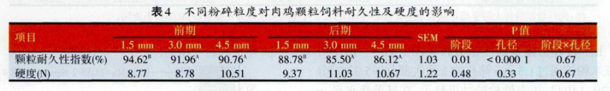 不同粉碎粒度對肉雞顆粒飼料PDI、硬度的影響見表4、圖5、圖6。從表3可以看出,前期顆粒飼料的PDI隨篩片孔徑增加而減小,1.5mm組的顆粒耐久性與3.0mm、4.5mm組差異顯著(P<0.05)3.0mm組與4.5mm組無顯著差異(p>0.05);后期顆粒飼料的PDI隨篩片孔徑增加呈先減小后增加的趨勢,1.5mm組與3.0mm組差異顯著(P<0.05)3.0mm組顆粒耐久性有最小值。試驗結果表明前期顆粒飼料的硬度隨篩片孔徑增加呈增加趨勢,但差異不顯著(p>0.05);后期顆粒飼料硬度隨篩片孔徑增加呈先增加后減小的趨勢,3.0mm組有最大顆粒硬度。