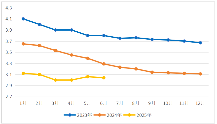 2023年—2025年生鮮乳月度價格走勢(元/公斤)