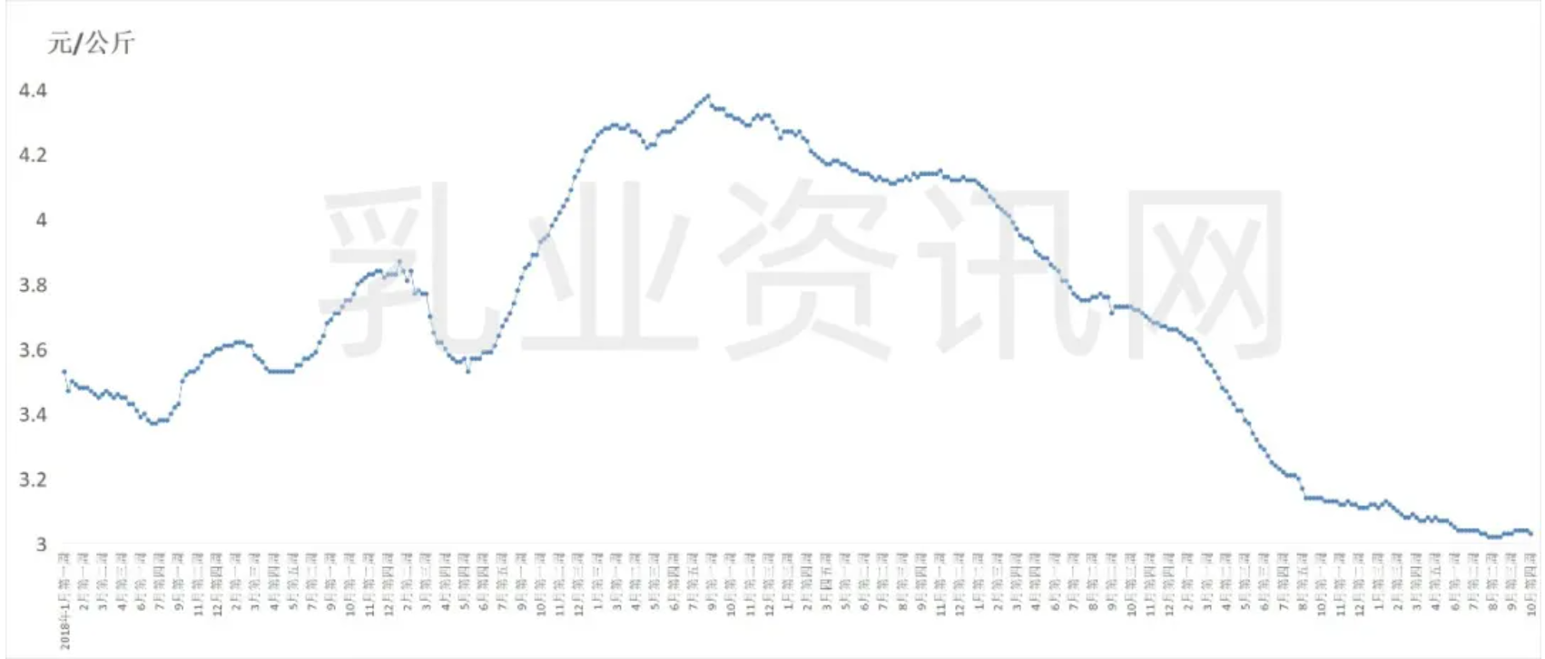 生鮮乳價格。內蒙古、河北等10個主產省份生鮮乳平均價格3.03元/公斤,比前一周下跌0.3%,同比下跌3.2%。