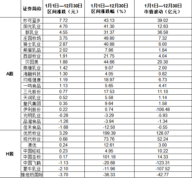 截至2025年12月30日,在可統計的27家A股及H股乳品上市公司中,超七成公司股價累計上漲,但整體漲幅較為有限。