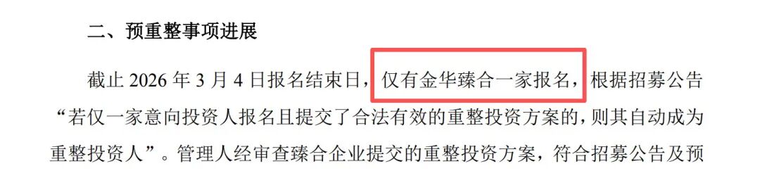 記者注意到,到3月4日報名結束日,僅有金華臻合一家意向投資機構有意愿參與小貝大美的重整項目。按照規則,若僅有一家投資者報名且提交有效方案,則自動成為重整投資人。