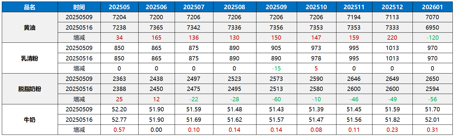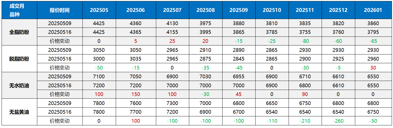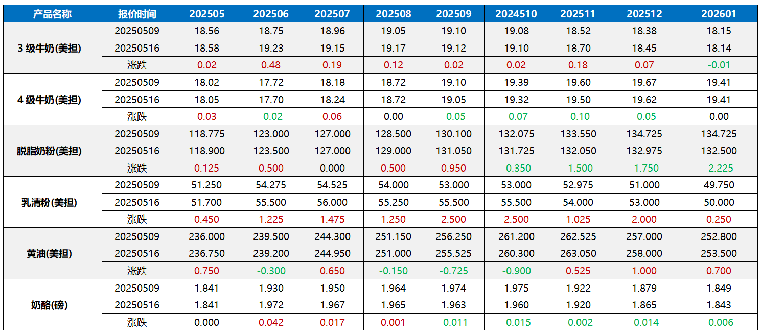 二、芝加哥期貨交易所(貨幣單位:美元)美國乳品漲多跌少,僅遠期脫脂和奶粉表現較弱。