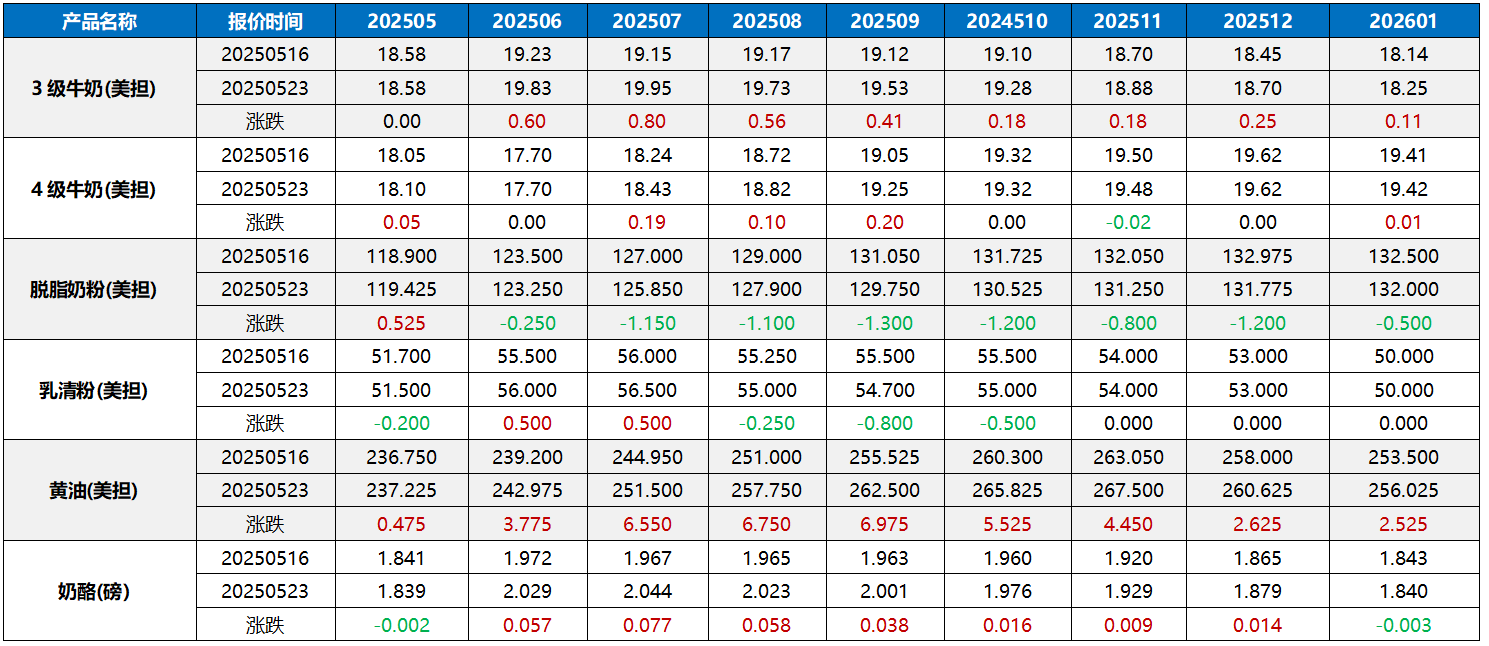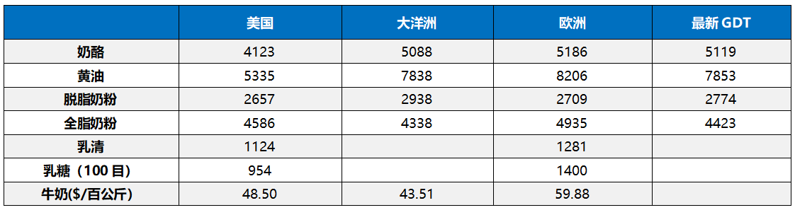 美國乳品強勢為主,僅脫脂奶粉走弱,黃油創出近期新高。