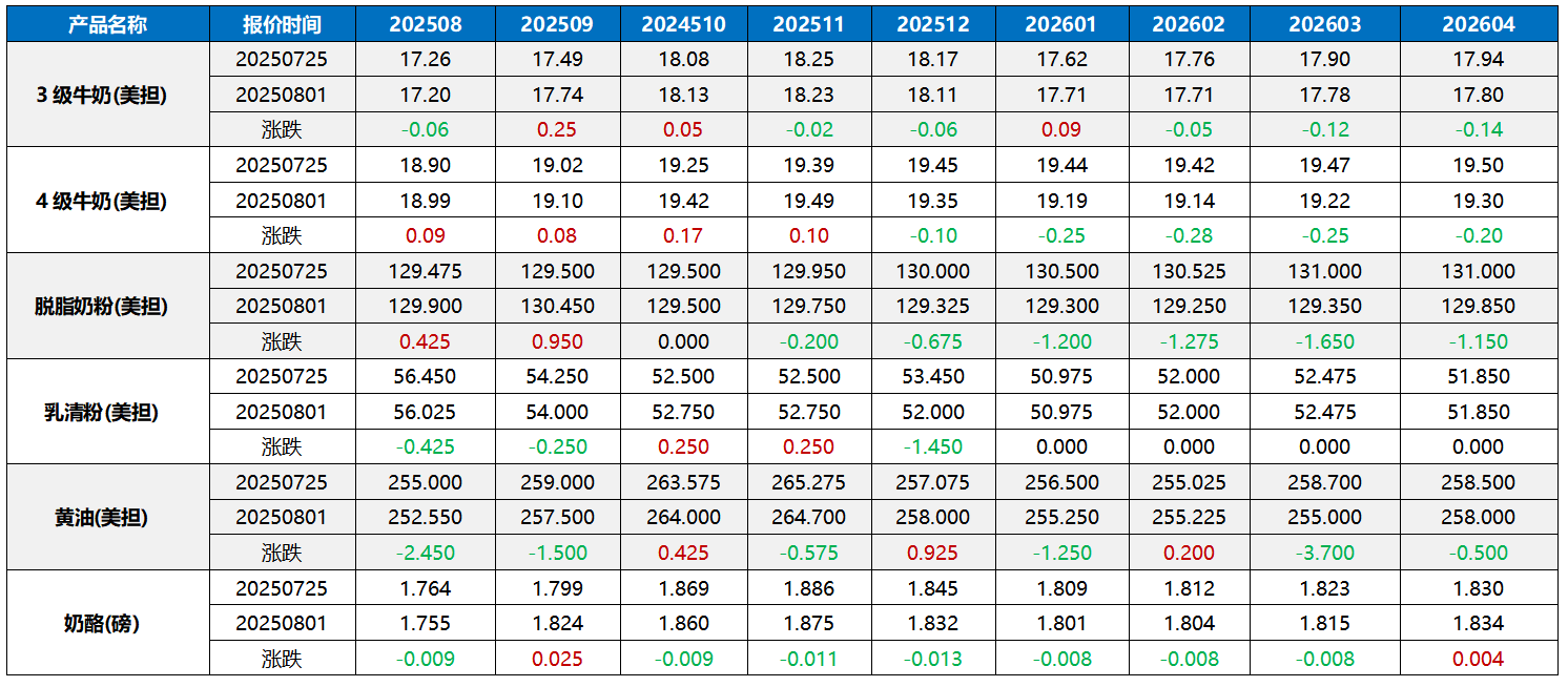 受低迷就業數據影響,美國乳品跌多漲少,而黃油的持續下挫給了近月脫脂奶粉反彈的機會。