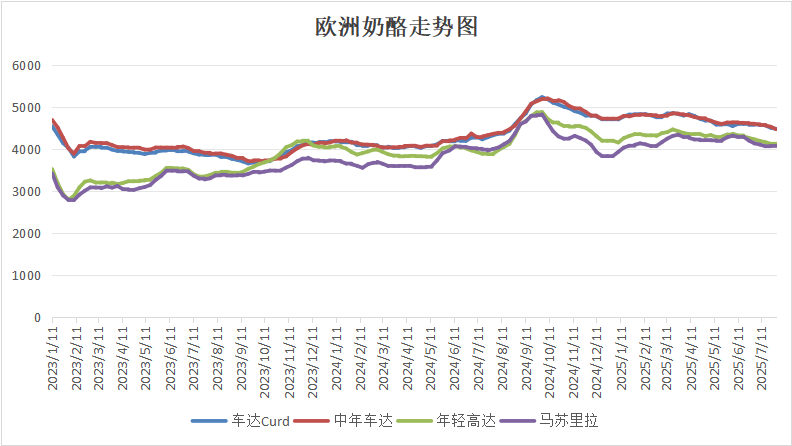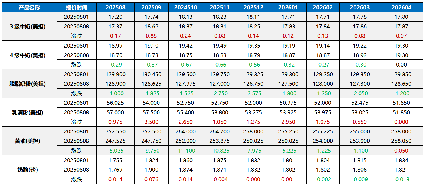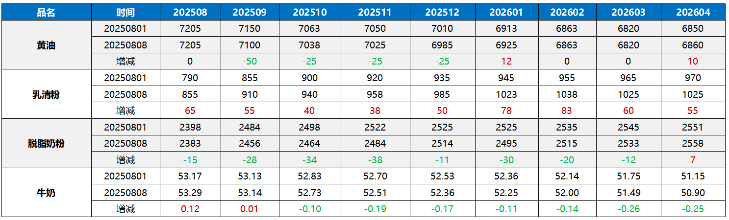 近期豐產和歐洲降息進入尾聲,讓黃油、脫脂奶粉一路下行,而奶酪的連續下挫也使得乳清粉未來供應看淡而價格上行。