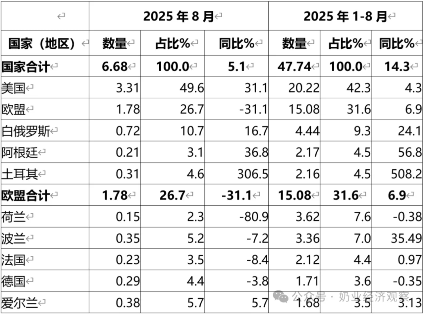 2025年1-8月國內乳清類產品進口量同比增14.3%