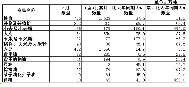 海關總署:2026年3月份中國主要糧食作物進口數量