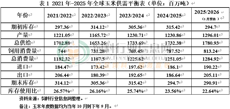 2026年1月12日美國農業部發布供需報告,對2025/26年度美國玉米播種面積、單產、產量、期末庫存有所上調,食品、種子和工業(FSI)用量下調。本月將2025/2026年度美玉米播種面積預估為9880萬英畝,較12月預測上調10萬英畝;2025/26年度玉米收割面積預估為9130萬英畝,較12月預測上調130萬英畝;2025/2026年度美玉米單產維持至186.5蒲式耳/英畝,較12月份預測上調0.5蒲式耳/英畝;2025/2026年度美玉米產量上調至170.21億蒲式耳,較12月份預測上調2.69億蒲。2025/2026年度美國玉米總用量上調9000萬蒲至164億蒲。飼用及其他用量上調1億蒲至62億蒲;2025/2026年度美玉米出口預估維持至32億蒲,與12月預測一致;2025/2026年度美玉米期末庫存上調1.98億蒲,至22.27億蒲。