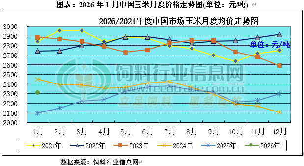 2026年1月國內主產區基層種植戶售糧心態略有松動,市場流通糧陸續逐漸增加,中儲糧采購力度顯著加碼,下游企業存在年前備貨需求,持續推升現貨價格走勢,不過中儲糧連續投放拍賣糧源,區域糧源得到補充,進口玉米等谷物仍有替代優勢,限制現貨進一步上漲空間,現貨價格維持窄幅偏強調整,全國現貨均價月環比上漲0.46%。