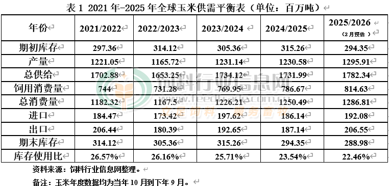 2026年2月10日美國農業部發布供需報告,對2025/26年度美國玉米出口上調,期末庫存下調。本月將2025/2026年度美玉米產量上調至170.21億蒲式耳,與上月持平;2025/2026年度美玉米出口量預估為33億蒲式耳,較上月上調約2億蒲式耳; 2025/2026年度美國玉米在乙醇行業的用量預計為56億蒲,和上月預測持平;2025/2026年度美國玉米飼用及其他用量為62億蒲,與上月持平;2025/2026年度美玉米出口預估維持至33億蒲,較上月上調1億蒲式耳;2025/2026年度美玉米期末庫存調低1億蒲式耳,至21.27億蒲式耳。