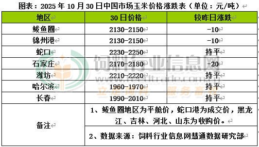 國內主產區新糧上市不斷增多,陳糧庫存仍在釋放,新陳糧共同供應市場,養殖持續虧損狀態下,飼料企業建庫意愿一般,深加工企業維持相對的庫存,隨采隨用為主,價格繼續偏弱震蕩。汽運運輸成本上漲,北方港口晨間集港量小幅減少,月內東北玉米外運量有所增加,北港庫存處于年內相對低位。受北港收購價下跌和盤面持續弱勢影響,南方港口成交清淡,受成本支撐貿易商報價跌幅有限。國內玉米現貨價格基本穩定,局部小幅下跌。東北產區新季玉米尚未全面上市,優質糧源供應偏緊,基層種植戶及持糧主體售糧積極性尚可,新糧不斷上市供應,而鐵路運費優惠力度收緊,車皮緊張東北玉米外運速度較前期減慢,中儲糧陸續啟動收購新糧,但收購量普遍較少,貿易商根據訂單靈活控制收購量,深加工企業也已啟動大規模建庫存計劃,多數企業根據上貨情況小幅調整收購價。華北黃淮產區隨著氣溫降低潮糧出售壓力減輕,加之新糧價格走低,基層種植戶惜售情緒有所升溫,市場上量小幅下滑,貿易商建庫情緒較為謹慎,養殖利潤持續虧損狀態下,大型飼料企業還有部分小麥庫存,對新玉米采購多觀望為主,加工企業庫存同比偏低,多數企業根據廠門到貨量靈活調整收購價格。