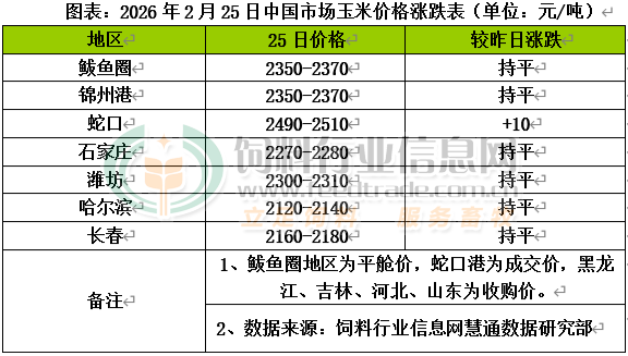 國內主產區基層玉米購銷尚未恢復,種植戶售糧進度恢復較慢,加工企業提前開工,庫存不斷消耗,開始陸續啟動掛牌收購活動,玉米價格整體偏強運行。東北產地基層仍在春節氛圍中,玉米購銷偏淡,北方港口貿易商陸續收購,集港量仍不多,收購價格略高,庫存仍大幅低于去年同期。南方港口到貨成本繼續支撐價格,飼企采購以執行合約為主,市場成交量低位運行。國內玉米現貨價格基本穩定,局部小幅走高。東北產區受冷空氣和雨雪天氣影響,北方多地氣溫下行,玉米儲存難度也逐步降低,加之年前余糧存量持續減少,年后基層售糧壓力減輕,當前種植戶仍處于過年氛圍中,玉米上量偏少,但中儲糧輪換玉米也在有序入市供應,飼料企業以及深加工企業庫存在安全水平線上,持續補庫動能減弱,對玉米價格上行空間有所限制。華北黃淮產區元宵節前多數種植戶售糧積極性不高,玉米上量偏少,春節后加工企業陸續恢復開工,現有玉米庫存不斷消耗,深加工企業為保障日常生產補庫,小幅提價促量,隨著價格上漲,持糧主體銷售心態開始松動,市場上糧有增加跡象,企業到貨量根據到貨量節奏以偏強震蕩為主。
