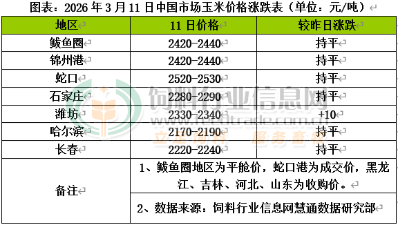 國內基層優質糧源流通偏緊,政策糧采購持續發力,繼續支撐行情偏強,不過隨著玉米與小麥價差持續收窄,小麥飼用替代性價比開始顯現,或將抑制飼用玉米需求空間。隨著玉米價格持續上漲,產地貿易商獲利出貨大量發往港口,北方港口到貨量上升至高位水平,據船期預報本周北港裝船貨量約130萬噸。南方港口3月美國高粱到貨量預計達 20 萬噸,谷物飼用替代性價比仍明顯,飼料企業對內貿玉米隨用隨采,觀望情緒升溫。國內玉米現貨價格基本穩定,局部小幅波動。東北產區氣溫全面回升,潮糧儲存壓力上升,基層售糧節奏逐步加快,糧源更多轉移至貿易環節,由于油價上調推升運費以及收購成本偏高,東北糧外調難度有所增大,深加工企業庫存持續消耗,企業積極補庫,但提價范圍有所收窄。據統計,本周中儲糧采購頻率有所加快,截止10日已采購總量310596噸,繼續穩定市場信心。華北黃淮產區經歷前期集中上量后,基層種植戶售糧積極性減弱,糧點購銷活躍度不高,貿易商出貨節奏減慢,加工企業廠門到貨規模有所收縮,不過養殖利潤虧損,飼料企業以隨采隨用為主,深加工加工仍處于虧損狀態,高價抑制需求承接不足,提價采購意向下降,僅部分到貨不足的企業小幅提價收購。