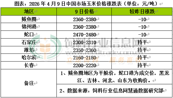 國內主產區貿易商心態松動,持續變現出貨,養殖虧損持續擴大,飼企采購極為謹慎,深加工企業按需采購,疊加小麥及進口谷物替代優勢凸顯,繼續壓制價格窄幅偏弱。天氣好轉基層余糧持續釋放,北方港口集港量略有增多,南北發運利潤倒掛存續,下游剛需補庫為主。南方港口內貿玉米庫存53.7萬噸,進口玉米15.2萬。飼企觀望心態增強,隨用隨采為主,市場成交不暢,貿易商報價小幅走弱。國內玉米現貨價格基本穩定,局部小幅下跌。東北產區進入4月政策性玉米收儲逐步進入收尾階段,玉米采購數量明顯減少。谷雨以后,東北將陸續進入春播工作,余糧收購進入尾聲,潮糧所剩不多,烘干塔出貨意愿較低,貿易商出貨意向相對一般,深加工企業庫存同比偏低,持續掛牌收購以保證生產,收購價格調整有限。華北黃淮產區近日來持糧貿易商惜售心態松動,出貨意愿提升,市場供應量增加,深加工企業庫存得到有效補充,按需收購為主,收購價格持續下跌,而基層余糧不多,貿易商挺價意愿偏強,出糧積極性降溫,加工企業廠門到貨明顯減少,收購價格窄幅調整。8日最低收購價小麥競價銷售出小幅回暖的態勢,計劃銷售801020噸,成交674362噸,成交率84.19%。最高價2490元/噸,最低價2320元/噸,成交均價2382.7元/噸,成交率84.19%。小麥已經具備一定的價格優勢,飼料企業使用小麥替代玉米比例小幅上升,占比在25%-30%之間。
