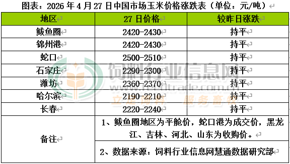 2026年4月27日大連商品交易所(DCE)玉米期貨主力合約c2607開盤價2415元/噸,收盤價2427元/噸,漲5元/噸,結算價2422元/噸,最高價2430元/噸,最低價2415元/噸,總成交量585815手,持倉1494487手。