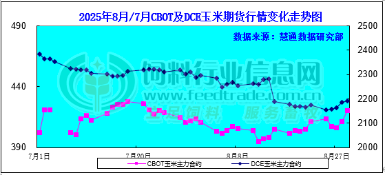 本月CBOT期貨價階段性上行,截止8月29日,12月合約價格比一月前上漲6.25美分/蒲式耳,報收420.25美分/蒲式耳;本月大連玉米期貨震蕩走低,截至8月29日大連玉米2511合約收于2191元/噸,較上月末下跌39元/噸。