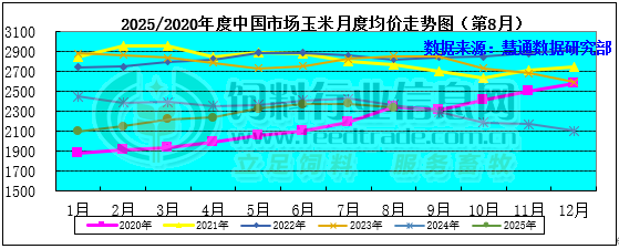 圖表:2025年8月中國玉米月度價格走勢圖(單位:元/噸)