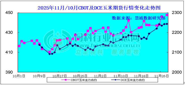 本月CBOT期貨價高位盤整,截止11月30日,3月合約價格比一月前上漲3.75美分/蒲式耳,報收447.75美分/蒲式耳;本月大連玉米期貨逐漸走高,截至11月30日大連玉米2601合約收于2244元/噸,較上月末上漲114元/噸。