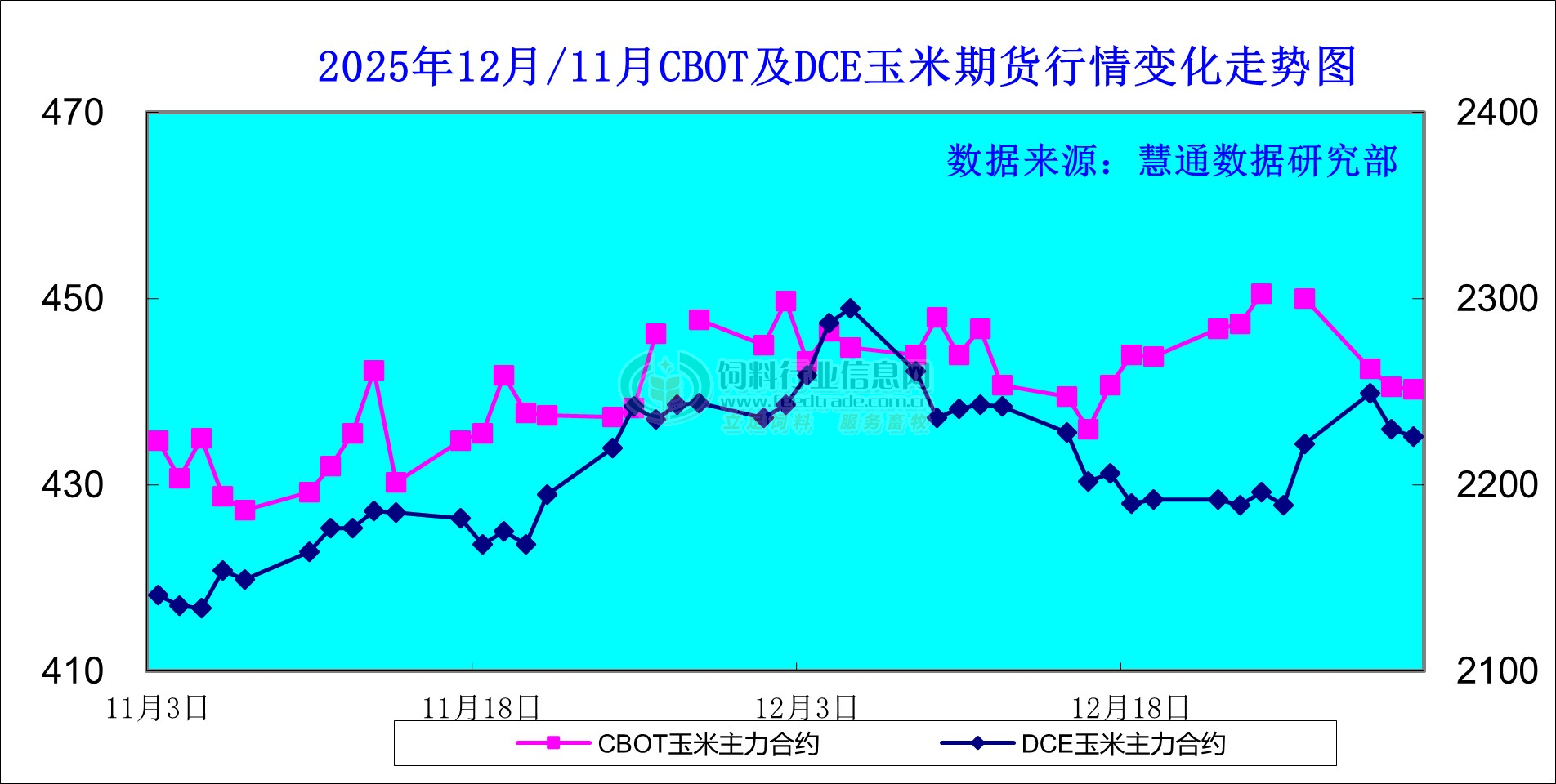 本月CBOT期貨價高位盤整,截止12月31日,3月合約價格比一月前下跌7.50美分/蒲式耳,報收440.25美分/蒲式耳;本月大連玉米期貨區間震蕩,截至12月31日大連玉米2603合約收于2226元/噸,較上月末下跌13元/噸。